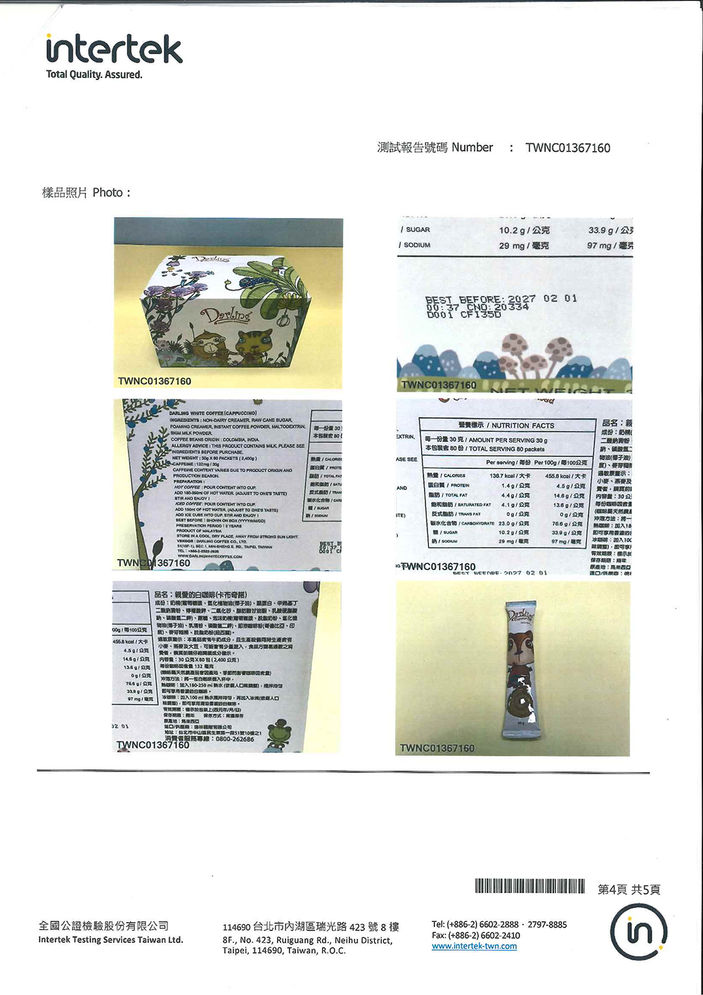 檢驗日期:2022/08/05/項目:親愛的經典原味白咖啡